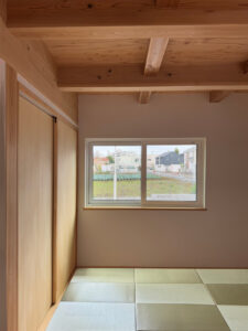 さらに、地中化によって電柱がなく開けた農園の景観を最大限に楽しめるよう、窓の配置や間取りも工夫して設計されました。特にリビング前の開放的な眺めは、写真では決して伝えきれない、現場でしか味わえない特別な開放感があります。